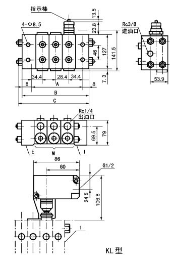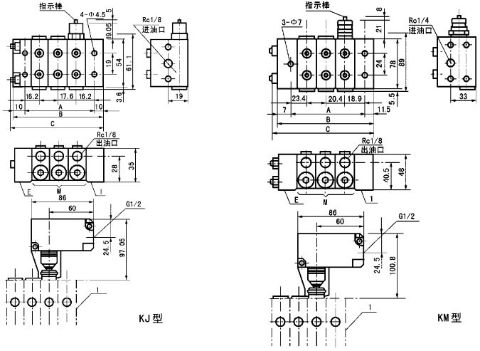 KJ、KM、KL系列單線遞進式分配器,它由中碳合金結構鋼制造的供給體、端部體和3~8片根據設計需要所確定的給油量和出油口數的中間體組合而成。分配器的正常出口設置于分配器的兩側面,在上面還設置有預備出口,各中間體的出油口內均裝有止回閥,能徹底防止因潤滑點背壓作用而產生潤滑脂的逆流,保證了各出油口的給油量定量、準確。