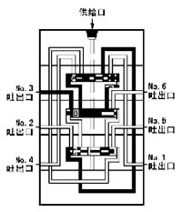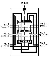 1、通過潤滑泵加壓送出的潤滑劑,經供給口流入按圖示箭頭方向分別推動活塞A、B、C 動作。此時活塞A、B左腔在油壓的作用下處在右位不動,活塞C右腔進入壓力,油開始向左移動。